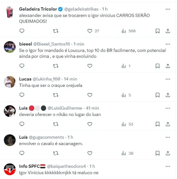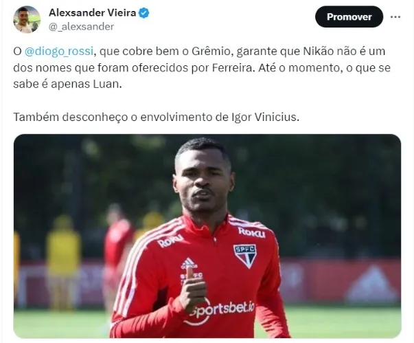 A reportagem também apurou que não existe também nenhum tipo de envolvimento de Igor Vinicius, como chegou a ser especulado por alguns sites. Ele fica no São Paulo e faz parte dos planos.