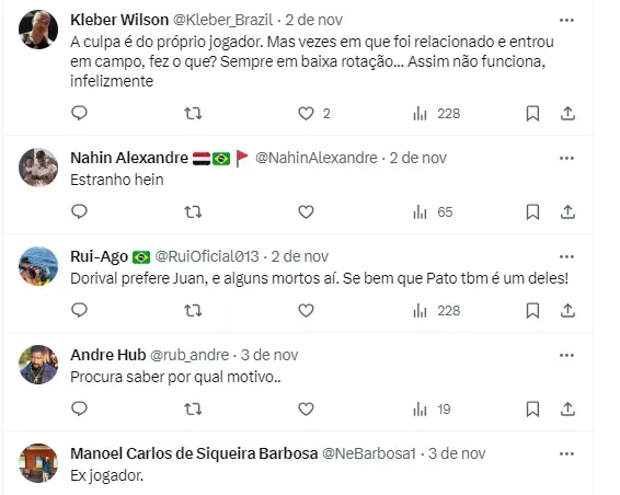 Porém, no jogo contra o Cruzeiro, Pato ficou novamente sem ser relacionado. Ele não atua desde o dia 20 de setembro, há mais de um mês. A última vez que foi para um jogo, foi contra o Goiás, no dia 18 de outubro, pelo Brasileirão.