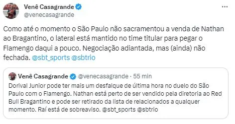 Mas, após informar o buchicho que tomou os bastidores do Morumbi, Vêne postou um tempo depois que: “Como até o momento o São Paulo não sacramentou a venda de Nathan ao Bragantino, o lateral está mantido no time titular para pegar o Flamengo daqui a pouco. Negociação adiantada, mas (ainda) não fechada”.