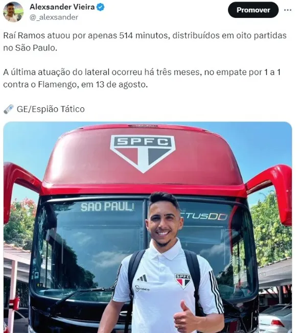 De acordo com levantamento do Espião Tático, em matéria publicada no GE neste sábado (11), às 8h (horário de Brasília), Raí Ramos atuou por apenas 514 minutos, distribuídos em oito partidas no São Paulo.
