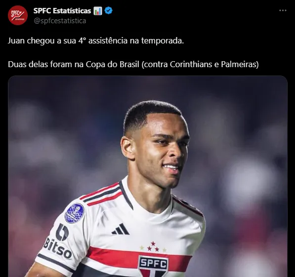 Agora, o jovem revelado em Cotia chegou a sua 4ª assistência no ano e o histórico pode animar na Copa do Brasil. Afinal, dos quatro passes para gol que tem em 2023, dois deles foram na competição, diante de Corinthians e Palmeiras. Isto é, por mais que a derrota tenha piorado ainda mais a situação do SPFC no Brasileirão, o jogo pode ter servido para ampliar o leque de opções de Dorival Júnior para o próximo domingo (24).