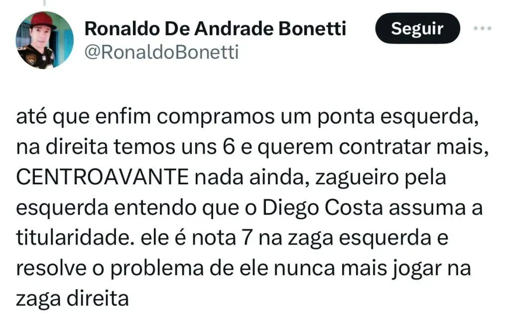 “Diante da demora do São Paulo em fechar com o Tricolor Gaúcho começam a surgir interessados. Posso assegurar para vocês que um representante do Corinthians também fez contato com o estafe de Ferreirinha para prometer uma proposta para o Grêmio”, disse o jornalista que finalizou