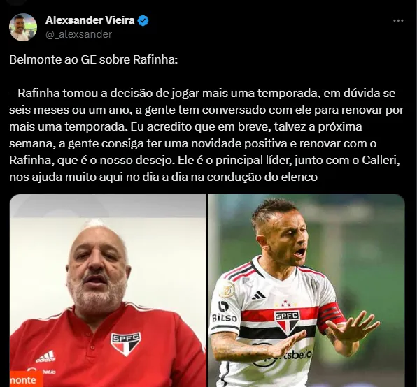“Rafinha tomou a decisão de jogar mais uma temporada, em dúvida se seis meses ou um ano, a gente tem conversado com ele para renovar por mais uma temporada. Eu acredito que em breve, talvez a próxima semana, a gente consiga ter uma novidade positiva e renovar com o Rafinha, que é o nosso desejo. Ele é o principal líder, junto com o Calleri, nos ajuda muito aqui no dia a dia na condução do elenco”, disse Belmonte.