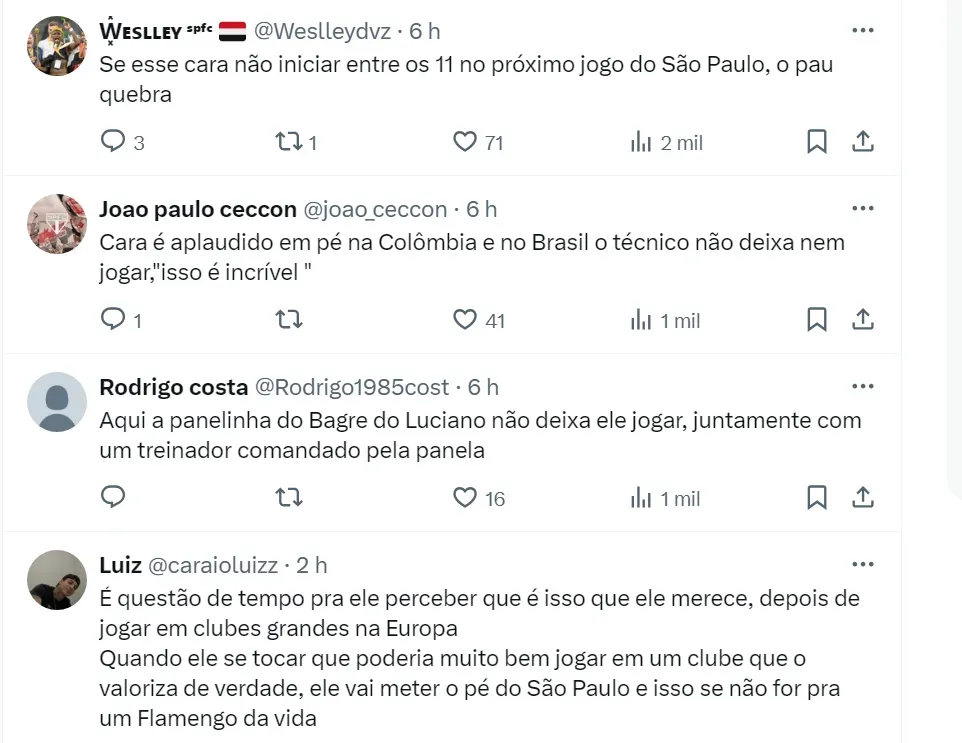 Néstor Lorenzo, comandante da seleção colombiana, deseja ver o jogador mais tempo em campo no SP para que possa atuar os 90 minutos quando for convocado. A próxima Data Fifa é em junho.