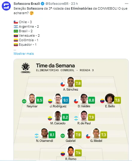 O desempenho de James fez com que o jogador fizesse parte da Seleção da 3ª rodada das Eliminatórias da Copa do Mundo 2026 do Sofascore, respeitado site que realiza dados e estatísticas do futebol mundial. Além de James, contam na Seleção da 3ª rodada os zagueiros Otamendi da Argentina, e o brasileiro Gabriel Magalhães, além de Neymar Jr. Confira no final da matéria a seleção completa.