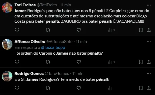 “Pra quem elogia o James é esse tipo de jogador que vocês gostam: bundão e covarde“, “Eu não entendi porque o James não bateu o pênalti” e “E o Sr. James Rodriguez? Tem medo de bater pênalti”, foram alguns comentários.