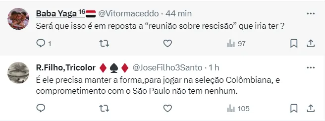Apesar de ter sido postado somente agora, as imagens mostradas por James são do treino da última sexta-feira (2). Nesta terça-feira (6), o jogador se reapresentou normalmente no CT da Barra Funda para dar sequência ao cronograma de trabalho.