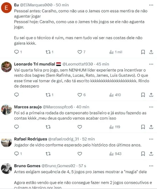 O colombiano iniciou a partida contra o Fortaleza no banco de reservas por opção de Carpini, mas atuou 33 minutos contra os nordestinos. James realizou o treino nesta segunda (15), no CT da Barra Funda, normalmente.