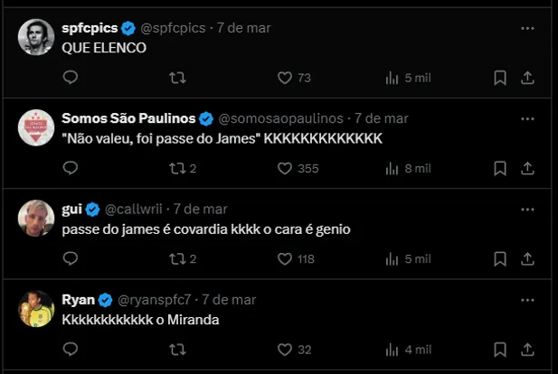 A torcida do São Paulo quer ver James entre os titulares, principalmente após o desempenho apresentado no clássico diante do Palmeiras. O atleta melhorou a equipe, acertou tudo dentro de campo.