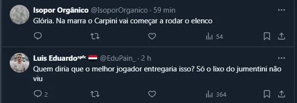 Quer dizer, de acordo com informações do jornalista Eder Traskini, do UOL, o camisa 55 conversou particularmente com Carpini e solicitou a presença no banco de reservas. Além da boa repercussão interna, a repercussão externa também foi boa.