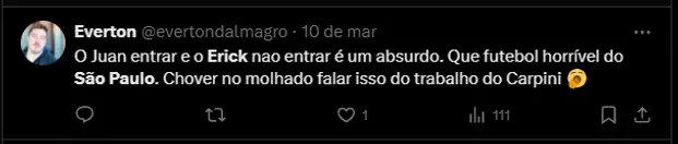 Tudo mudou após esse confronto. Erick perdeu espaço com Thiago Carpini. Nos últimos três confrontos do São Paulo, o atacante participou de apenas uma partida, totalizando 19 minutos em campo.