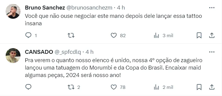 A pele que ficará eternamente marcada com um símbolo do tricolor é a do zagueiro Alan Franco. O argentino tatuou na perna a taça da Copa do Brasil, título conquistado pelo São Paulo em 2023, e o Estádio do Morumbi.