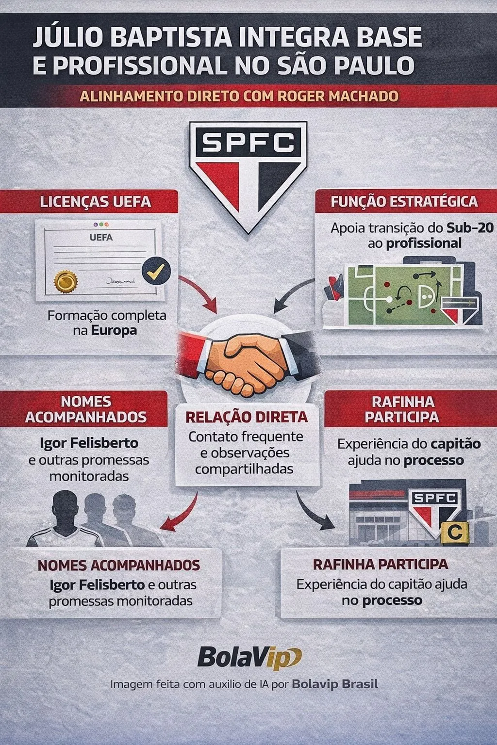 O São Paulo iniciou uma nova etapa na base com a chegada de Júlio Baptista para comandar o time Sub-20, mas o impacto do ex-jogador não ficará restrito apenas às categorias inferiores. Nos bastidores, o clube desenhou um plano que conecta diretamente o treinador ao elenco profissional, segundo apuração exclusiva do Bolavip Brasil.