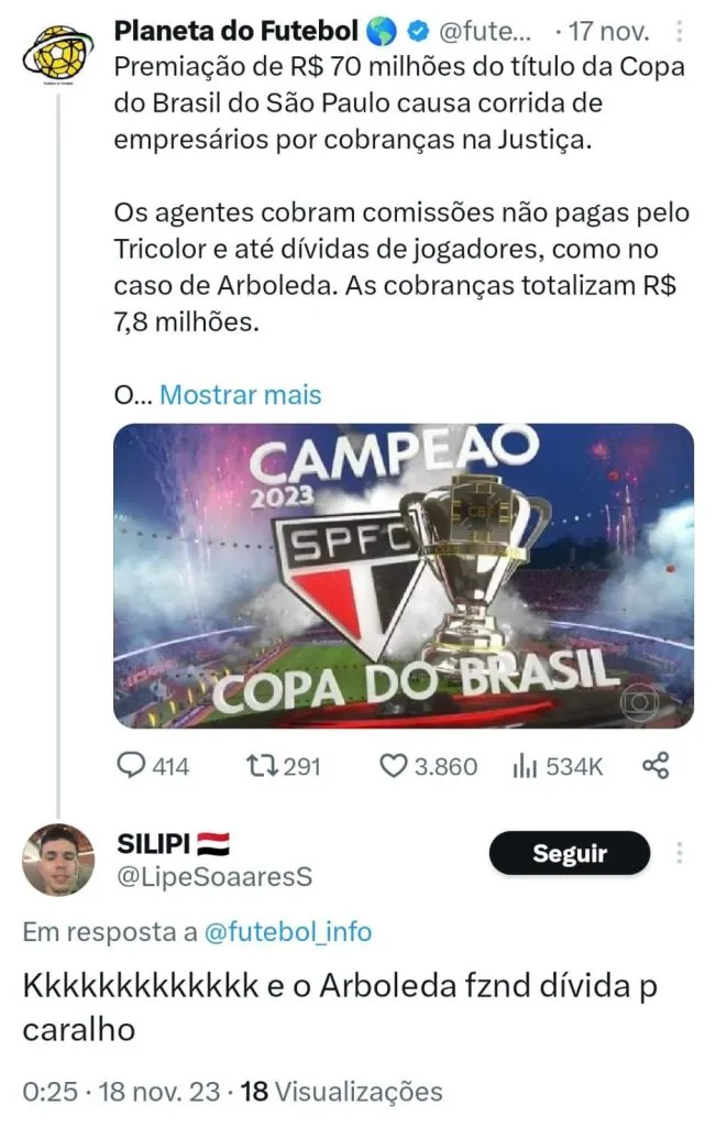 O São Paulo respondeu ao tribunal que ainda não foi estabelecida a data que realizará o pagamento por desempenho na Copa do Brasil e ainda que existem outras ordens de penhora contra o atleta.
