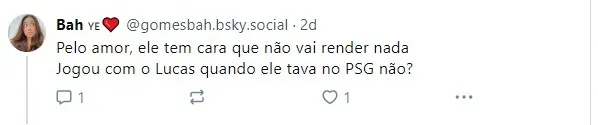 “Pelo amor, ele tem cara que não vai render nada Jogou com o Lucas quando ele tava no PSG não?”.