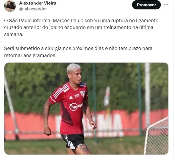 O São Paulo informou que o meia-atacante Marcos Paulo teve constatada uma ruptura no ligamento cruzado anterior do joelho esquerdo e será submetido à cirurgia. A contusão aconteceu na última sexta-feira (1) e no fim de semana houve a confirmação. Lesões nesse nível demoram de 6 a 8 meses de recuperação, ou seja, ele não joga mais na temporada.