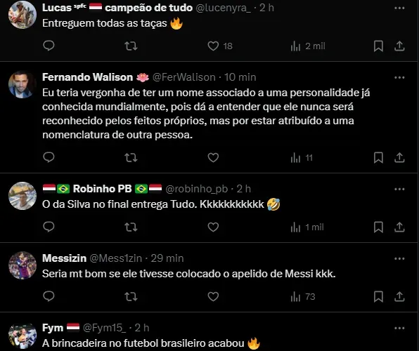 Nas redes sociais, os torcedores do São Paulo comentaram sobre o nome do garoto da base e destacaram a curiosidade. Alguns viram até mesmo o sobrenome ‘da Silva’, que ‘entrega’ a nacionalidade.
