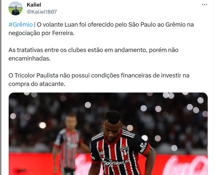 Oficialmente, o São Paulo não tem o valor desejado pelo Grêmio para a venda em definitivo de Ferreira, por isso ofereceu uma troca com os gaúchos. Neste molde, dois jogadores de Dorival Júnior foram oferecidos.