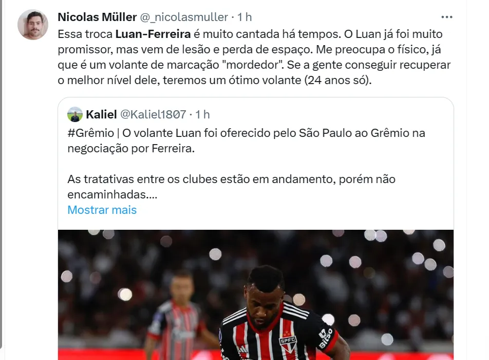 O colega Diogo Rossi, setorista do Grêmio, informou que um deles é o volante Luan. O jogador não agradou a Dorival e comissão técnica e, por isso, aparece como ‘moeda de troca’ para 2024.
