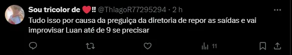 São dois motivos principais para essa decisão: a falta de reforços para a sequência da temporada, além do alto número de jogadores lesionados. Luan é visto como uma peça que pode ajudar no meio-campo.