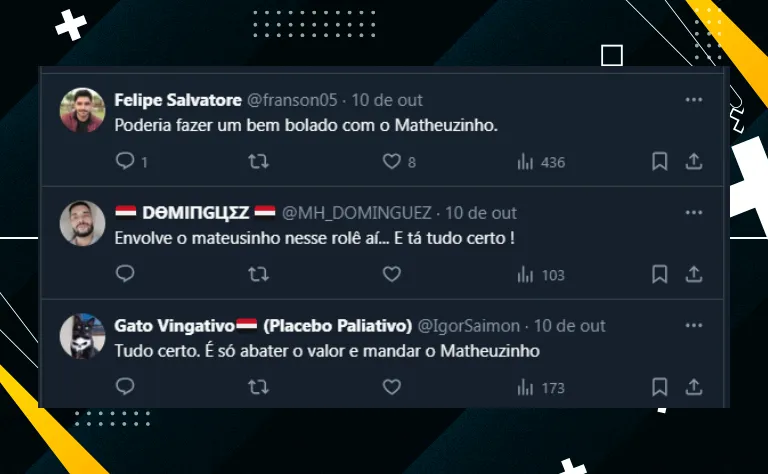 Até por conta disso, a divisão de opiniões entre os são-paulinos é algo notável. Inclusive, muitos torcedores estão pedindo para o SPFC tentar envolver o meia Matheuzinho no negócio.