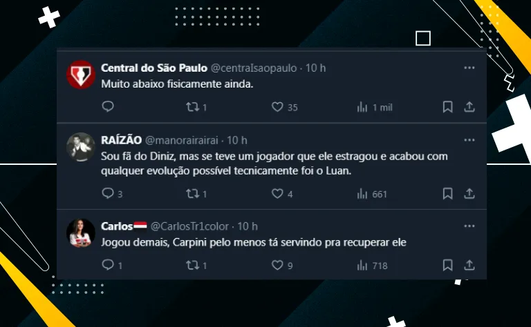 Ademais, Luan terminou o jogo com 11/13 duelos ganhos (85%) e um índice altíssimo no acerto de passes: (46/49, 94%). Não à toa, os são-paulinos o elogiaram muito na web.