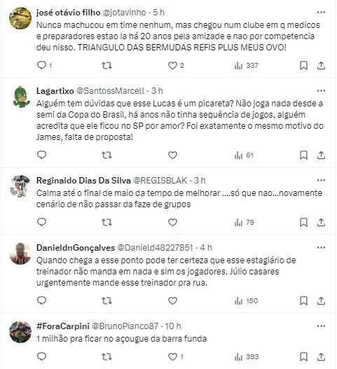 Resultado que complica o momento do técnico Thiago Carpini no Morumbi, que está pressionado pelos últimos resultados da equipe. Embora seja apoiado pelos atletas, a demissão já virou assunto nos bastidores do Clube.