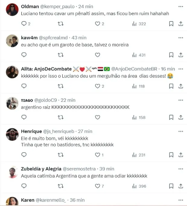 “No treino antes do jogo da Libertadores, nesse jogo de agora, ele estava conversando, não vou falar o nome do jogador mas ele falou: ”quando você dominar a bola aqui, é Libertadores e tal tem que ter essa malandragem. Ai ele dominou e disse: ”encosta aqui em mim”, e ele se jogou no chão, deu um mergulho mesmo e a gente começou a rir“, contou o jogador.