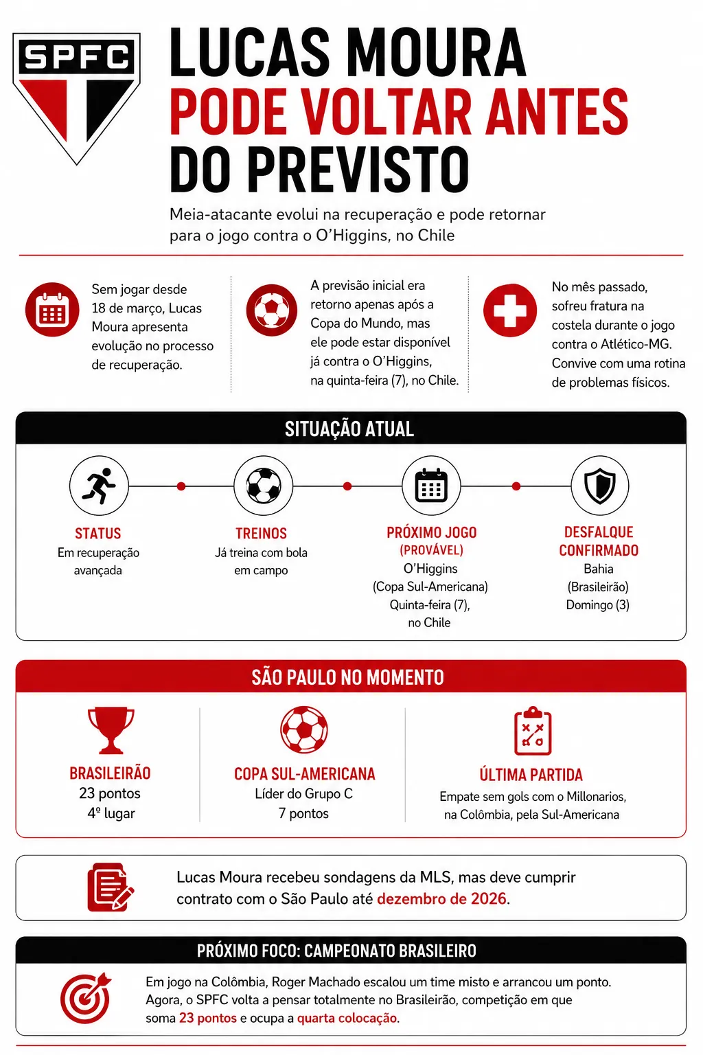 Lucas Moura recebe sondagens da MLS, a liga norte-americana de futebol, mas deve cumprir o contrato com o Tricolor Paulista, que é válido até dezembro de 2026.