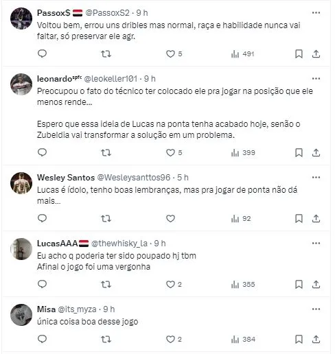 O duelo marcou o retorno de Lucas Moura, que ficou pouco mais que um mês afastado por lesão. Foi a primeira vez que o atacante foi acionado pelo técnico Luis Zubeldía e a situação do ídolo deve sofrer modificações.