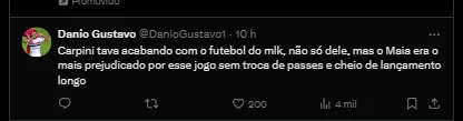 O jogador iniciou sua fala comentando sobre a saída do antigo treinador e relevando a chateação do grupo com a demissão de Carpini. “É uma vitória inegavelmente importante, conquistada em meio a uma semana turbulenta no centro de treinamento. Ficamos tristes com a saída do Carpini e queremos agradecê-lo”, disse o camisa 10.