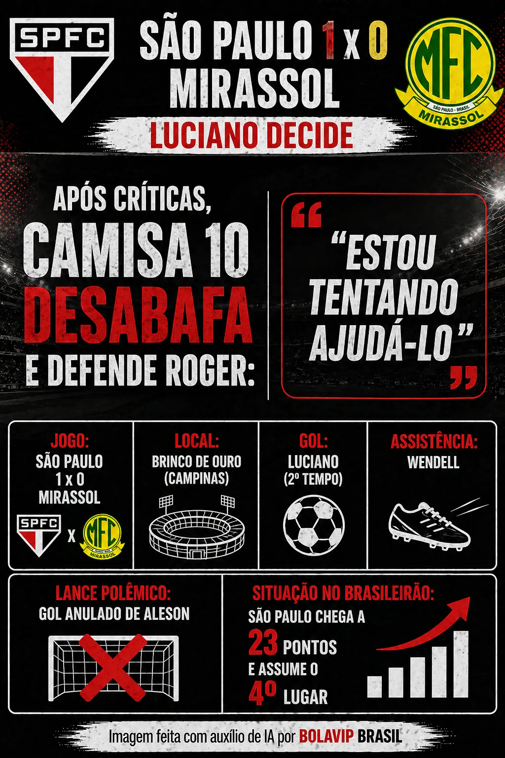 Em jogo disputado na noite deste sábado (25), o São Paulo recebeu o Mirassol, no Estádio Brinco de Ouro da Princesa, em Campinas. Em campo, o gol salvador veio na metade final do segundo tempo, com Luciano.