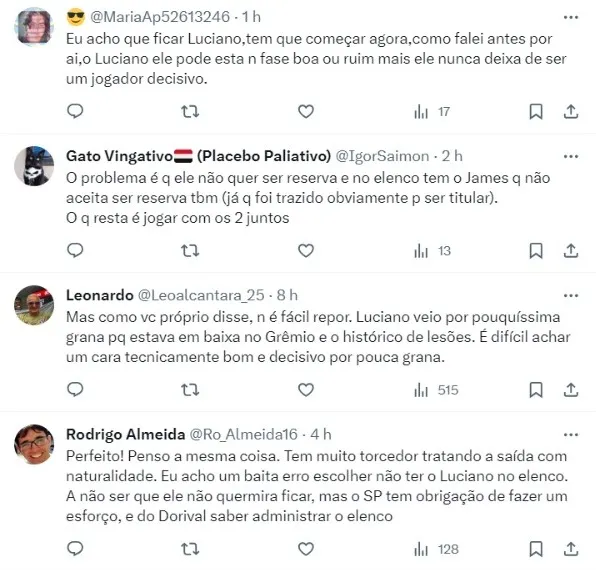 “No momento que conversamos a respeito do elenco, natural que eu vá posicionar a cada jogador. O Luciano é um jogador importante”, argumentou.