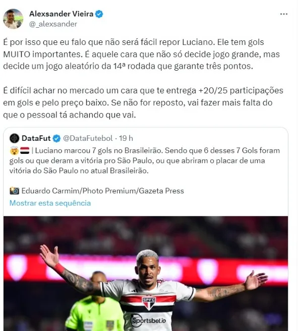 Luciano marcou sete gols no Brasileirão. Sendo que seus deles foram gols ou que deram a vitória pro São Paulo, ou que abriram o placar de uma vitória do Tricolor Paulista no atual Campeonato Brasileiro.