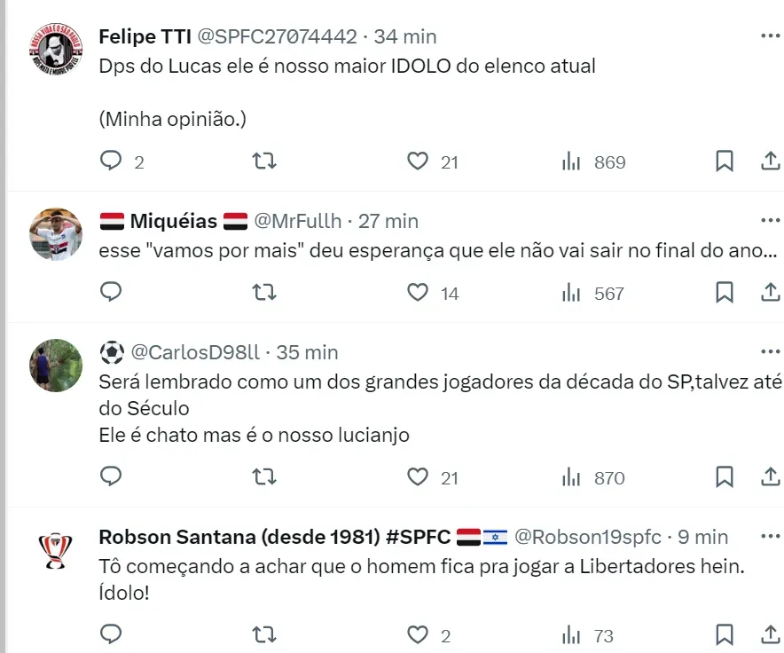 No Twitter, um torcedor disse: “Esse ‘vamos por mais’ deu esperança de que ele não vai sair no final do ano…”. Outro são-paulino afirmou: “Tô começando a achar que o homem fica pra jogar a Libertadores, hein. Ídolo!”.