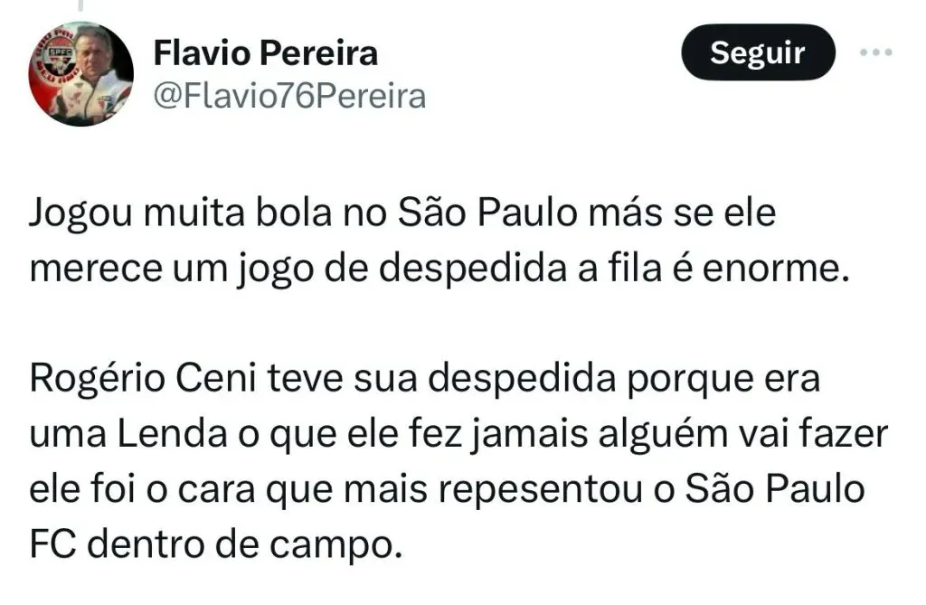 “Jogou muita bola no São Paulo más se ele merece um jogo de despedida a fila é enorme. Rogério Ceni teve sua despedida porque era uma lenda o que ele fez jamais alguém vai fazer ele foi o cara que mais representou o São Paulo FC dentro de campo”, afirmou