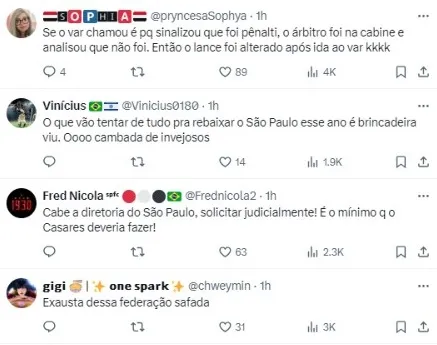 “Se não tivesse tocado na bola, ela iria para trás. Não tem como cabecear a bola… Vou falar por experiência própria, eu cansei de tomar na cabeça assim, e ninguém deu nada. Acontecia direto. Se não tivesse dado o pênalti, o Palmeiras também estaria indignado? Ia passar batido. Não ia ter (reclamação)”.