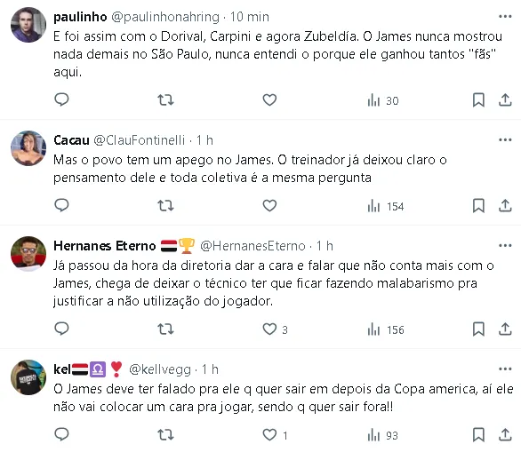 “É um jogador com contrato no São Paulo, e está cada vez mais claro que ele não está nos planos do técnico. Agora vai ter a Copa América, ele vai ser convocado, e a janela vai determinar o futuro do James. Não temos nenhuma proposta. A partida (para outro clube) tem que ser boa para o atleta e principalmente para a instituição“, afirmou à ESPN.