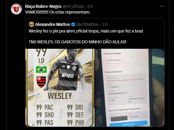 A torcida do Fla conseguiu ajuda de titulares do time da Gávea, contando o lateral-direito Wesley e o meio-campista Victor Hugo para arrecadar mais de R$ 70 mil em PIX, visando a recepção mais infernal possível para o Soberano no duelo a ser realizado no Rio de Janeiro. O discurso até mudou nas últimas horas.