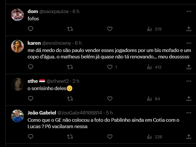 “Garoto de ouro. Uma pessoa nota 1000. Dentro de campo tem um futuro brilhante. Está sendo um prazer jogar ao lado dele. Se tornou um amigo. Amo Cotia, (o Pablo Maia) veio de Cotia… Cotia é uma mina de ouro. Então, fico muito feliz de ter vindo de lá e ver garotos chegando para poder fazer parte desse grupo maravilhoso”, destacou L. Moura.