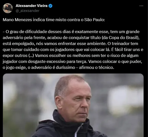 “O grau de dificuldade desses dias é exatamente esse, tem um grande adversário pela frente, acabou de conquistar título (da Copa do Brasil), está empolgado, nós vamos enfrentar esse ambiente. O treinador tem que tomar cuidado com os jogadores que vai colocar lá. É fácil tirar uns e expor outros. Vamos escolher os melhores sem ter o risco de algum jogador com desgaste excessivo para terça. Vamos colocar o que puder, o jogo exige, o adversário é duríssimo”, disse Mano.
