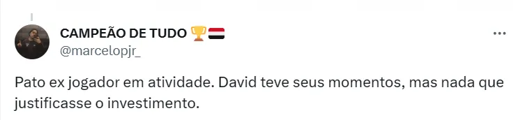 Os jogadores viveram situações distintas em 2023. No caso de Pato, as lesões e a concorrência no ataque pesaram contra o camisa 12. Já David fez bons jogos e gols importantes, mas também ficou lesionado e perdeu espaço.