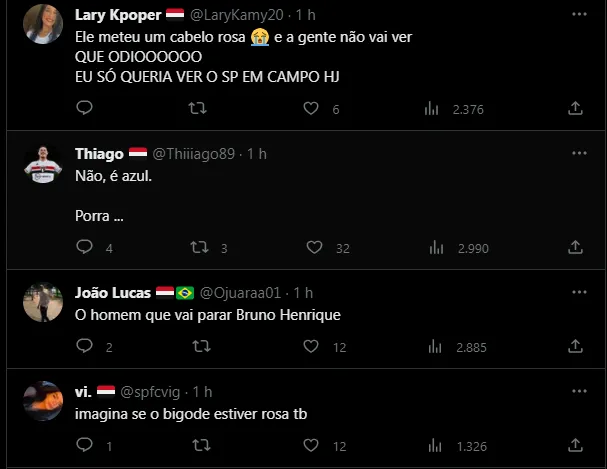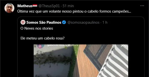 Em sua conta oficial no Instagram, o volante Gabriel Neves publicou um story com o cabelo pintado de rosa, o que gerou comentários da torcida na web. Inclusive, o tema serviu para alguns adeptos criticaram a sua ausência no time titular diante da LDU. Confira alguns tweets sobre o novo visual do camisa 20: