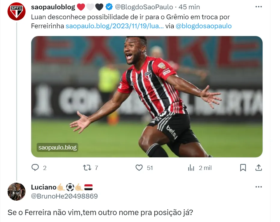Luan é Cria de Cotia e soma dois títulos pelo São Paulo: o Campeonato Paulista de 2021 e a Copa do Brasil de 2023. O jogador é visto como uma boa moeda de troca no mercado.