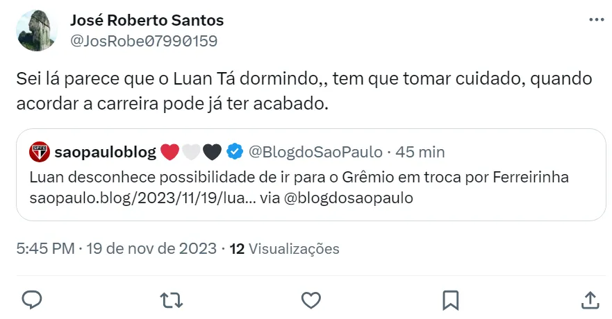 Com esse cenário, talvez atrapalhe os planos do Tricolor Paulista de fechar com o atacante Ferreirinha ou vai precisar convencer Luan a mudar para Porto Alegre. O volante tem futuro incerto no Clube do Morumbi.