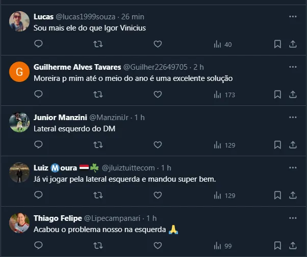 Na ocasião, Rafinha precisou ser substituído e, como Igor Vinícius não estava entre os reservas, Moreira foi o escolhido. Vale destacar que o lateral passou mais de um ano se recuperando de uma lesão grave no joelho.