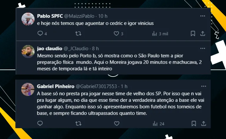 Por fim, além de Moreira, vale frisar que o SPFC também negociou William Gomes com o Porto. Diferentemente do LD, ele vem atuando no time principal e realizou quatro partidas, mas ainda não brilhou. Veja os comentários sobre o momento de Moreira: