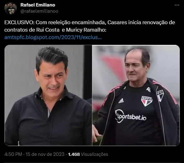 De acordo com o jornalista Rafael Emiliano, a dupla, que tem contrato até o final desta temporada, deve ter o seu contrato renovado por Julio Casares, que aprova o trabalho realizado nos bastidores.