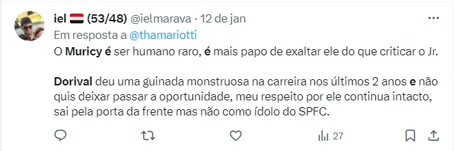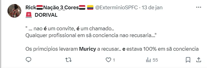 Muricy ainda revelou que para o São Paulo a decisão e Dorival Jr. foi difícil: “Para a gente foi muito duro quando começaram a falar disso, foi muito difícil, porque você faz um planejamento, e aí é muito complicado. Eu sou muito amigo dele, é um sonho do cara, a gente respeita, eu falei para ele ‘legal que é o seu sonho, mas para a gente foi mau para caramba”, finalizou Muricy.