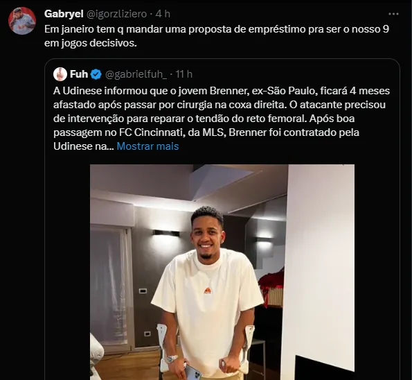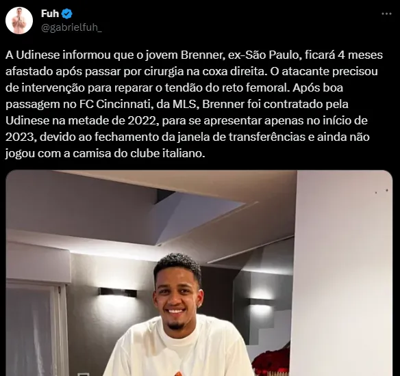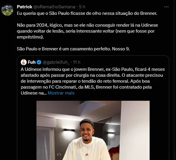 “Eu queria que o São Paulo ficasse de olho nessa situação do Brenner. Não para 2024, lógico, mas se ele não conseguir render lá na Udinese quando voltar de lesão, seria interessante voltar (nem que fosse por empréstimo). São Paulo e Brenner é um casamento perfeito. Nosso 9”